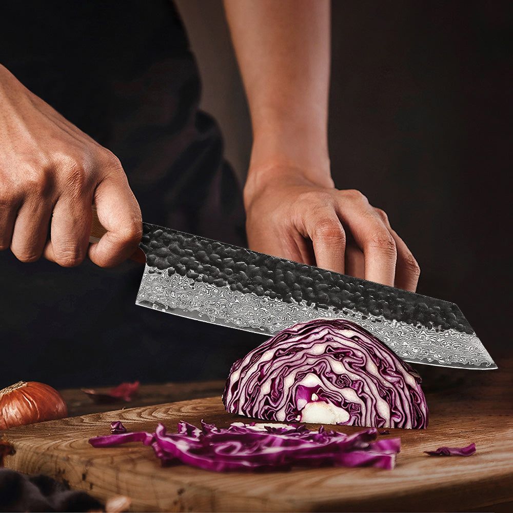 Élevez votre expérience culinaire avec ce couteau de chef en acier Damas, où tradition japonaise et innovation moderne se rencontrent pour sublimer votre art de la découpe.