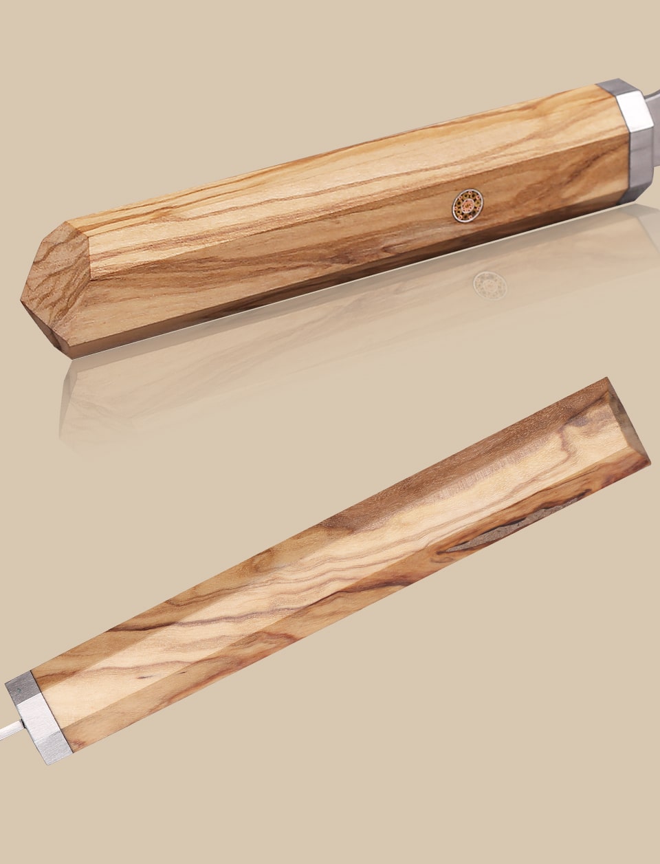 Le manche en bois de rose, soigneusement sculpté, allie luxe et ergonomie, pour une prise en main parfaite et un équilibre optimal. Son design réduit la fatigue, même lors de longues sessions en cuisine, vous permettant de maîtriser chaque geste avec aisance.
