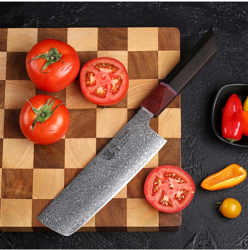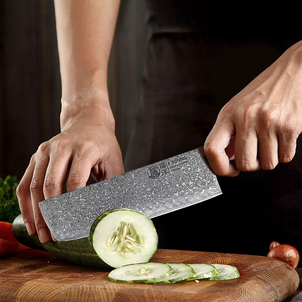 Sa lame, composée de 67 couches d'acier Damas, offre une netteté spectaculaire et une robustesse incomparable. Trancher, émincer, et découper les légumes devient un jeu d’enfant grâce à une précision inégalée. Chaque coupe est fluide et précise, transformant vos gestes en véritables œuvres de maîtrise.