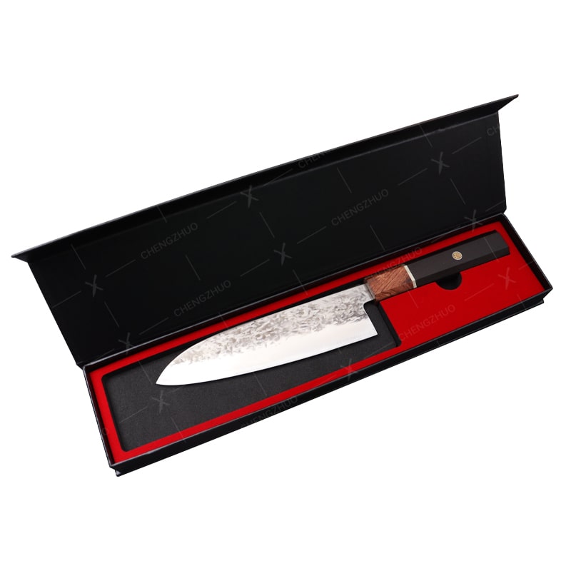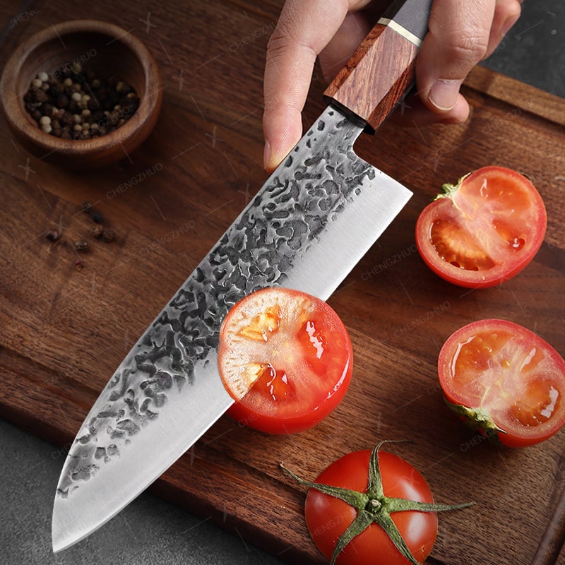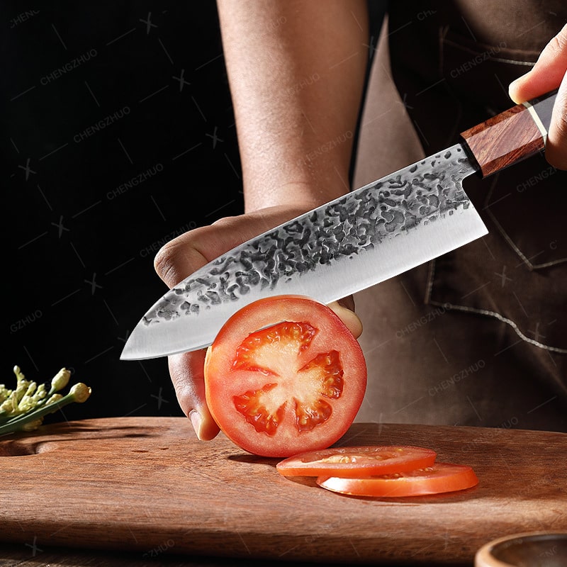 Le manche en bois d’olivier, poli à la perfection, procure une prise en main ergonomique et confortable**, offrant un équilibre parfait pour un contrôle optimal. Son grain naturel et son fini luxueux font de ce Santoku un objet aussi fonctionnel qu’esthétique, idéal pour les professionnels comme les amateurs exigeants.